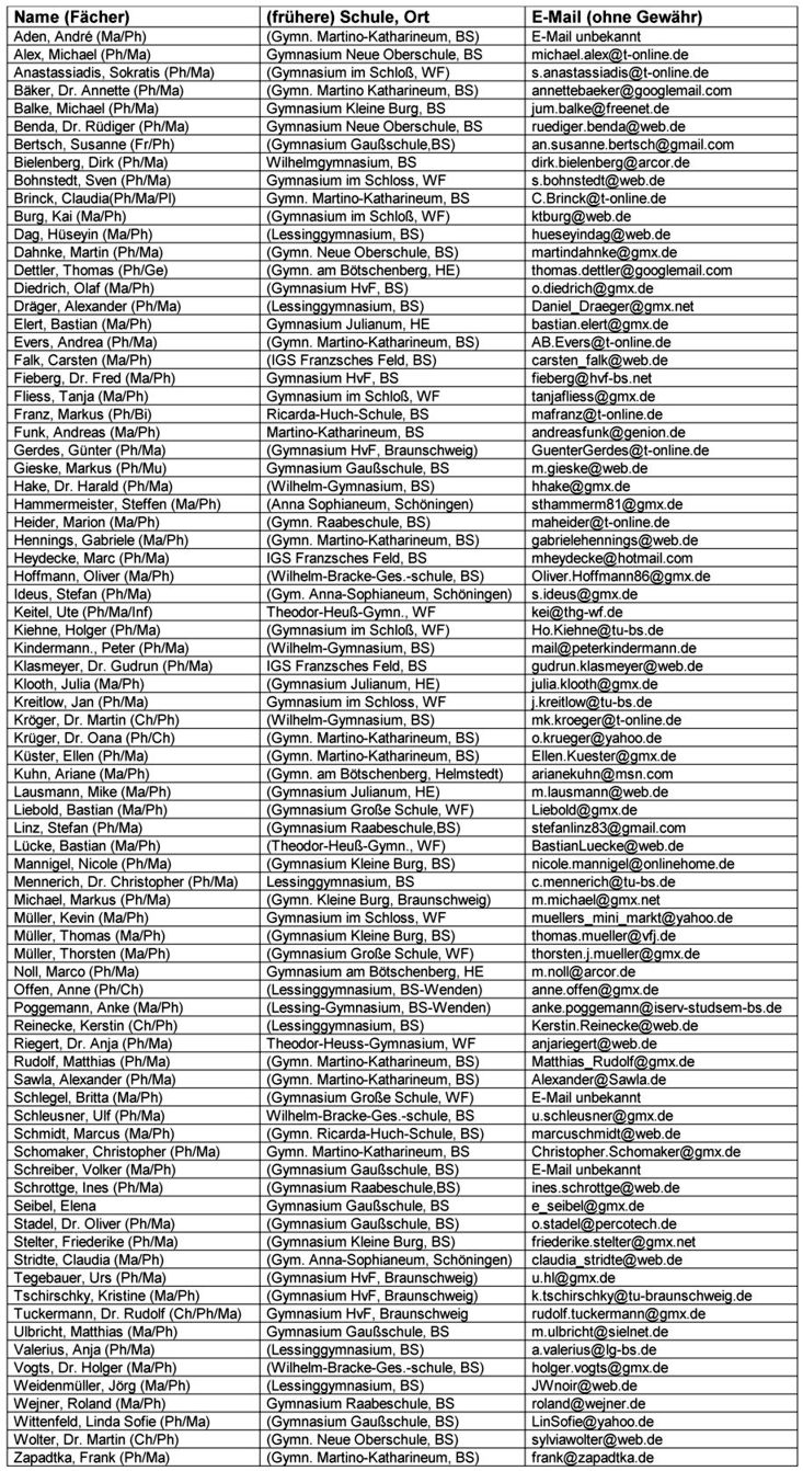 Bernd Mundlos, StD ehemals: Gymnasium Neue Oberschule Beethovenstr. 57, 38106 Braunschweig Tel.: 0531/23846-0, FAX: 0531/23846-46 Bis Juli 2014 fanden die Fachsitzungen 14-täglich im Physikraum 21 bzw. im 2. Lehrerzimmer der Neuen Oberschule montags in den ungeraden Kalenderwochen von 16.30 Uhr bis ca. 18.45 Uhr statt. privat: Grothstraße 25, 38110 Braunschweig TEL: 05307/91030, FAX: 05307/91031 Mundlos_@_t-online.de |